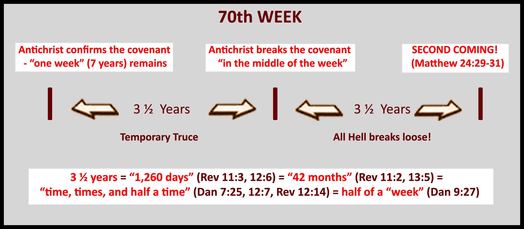 Finally, there is the statement that there is no more need for a 7 year reign of the Antichrist with only 3.5 years of tribulation after he breaks the agreement. This contradicts the several explicit statements (7 altogether, I think) in the Bible that there will be a 3.5-year period of Great Tribulation (under the Antichrist “beast”) just before the Second Coming of Christ: Daniel 7:25, 12:7 and Revelation 11:2,3; 12:6,14; 13:5. In addition, the passages in Daniel 9:27 and 11:28,30-32 show that the “covenant” ties in with the appearance of the “abomination of desolation”. Forward to Jesus’ own words in Matthew 24 and Mark 13, we learn that the “abomination” (“spoken of by Daniel the prophet”) would be the key event kicking off the “great tribulation” and would be a sign coming just prior to Christ’s Second Coming. This was Jesus’ answer to the disciples’ question, “What will be the sign of your coming, and of the end of the age?” It seems straightforward enough: like the “abomination of desolation”, the “covenant” also is an event coming in the future shortly before the Second Coming.