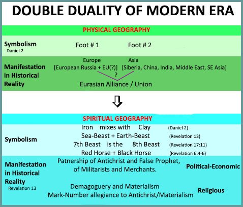 And it appears that this dual feature of the final empire will manifest in both its physical geography and in what we might call its spiritual geography. (See Post on this subject.) This may be a speculative notion, but could it be that the dual territorial feature of the final empire (that is, its physical geography) will manifest as the merger of the European and Asian land masses? (See the Eurasian map below and this Post for more information about this possibility.)