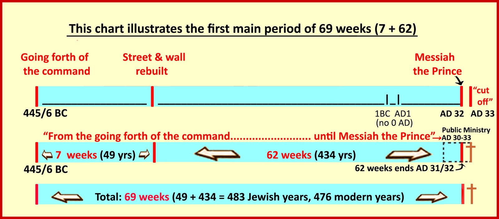 1) 7 weeks (49 years): from the time of the Persian king’s authorization to re-build Jerusalem and its wall until the work is completed